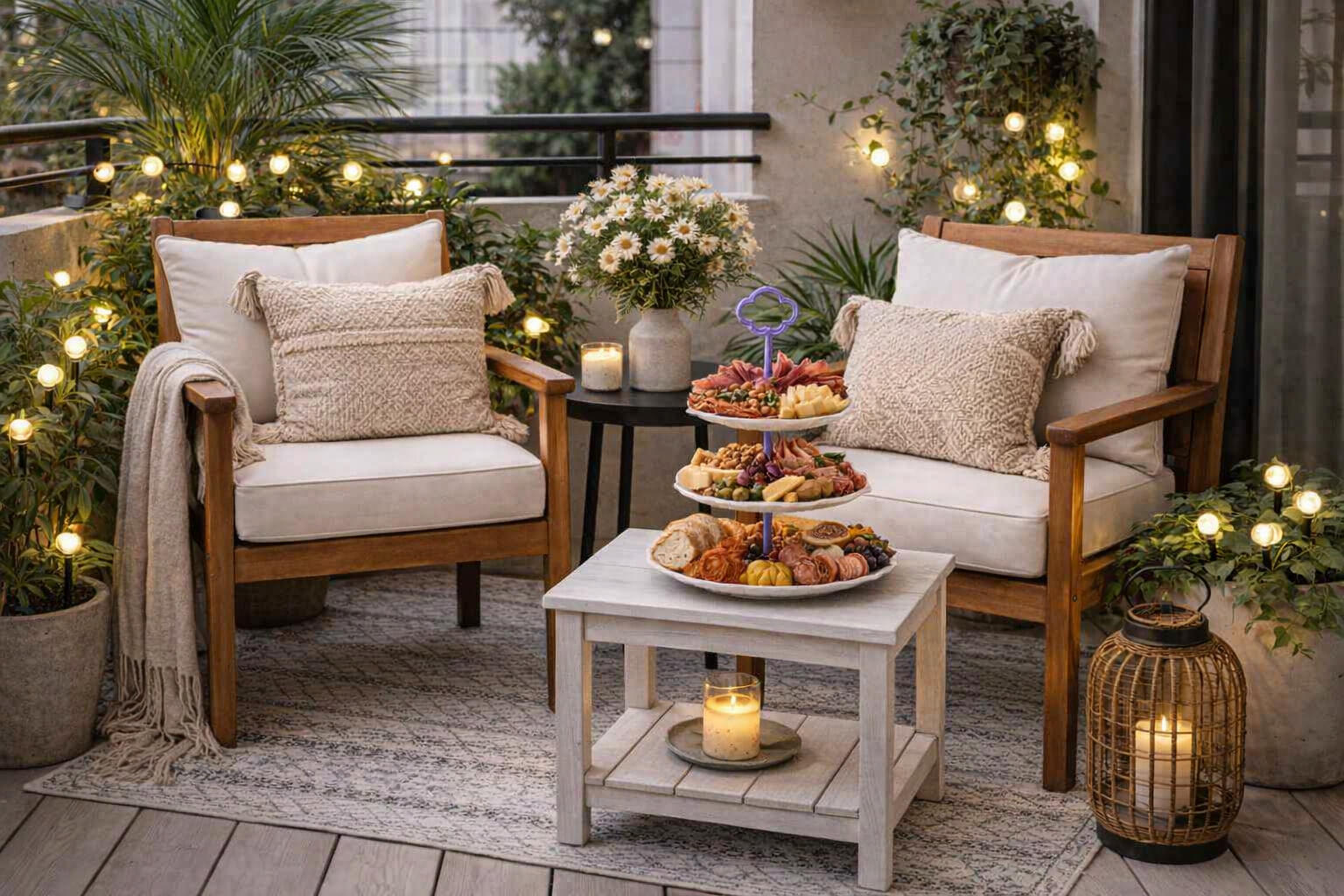The Summerflos three-tier tray makes charcuterie feel effortless, Lubitte side tables keep candles and drinks within reach, and Albelt solar lighting adds a warm, confident glow as the evening settles in.
